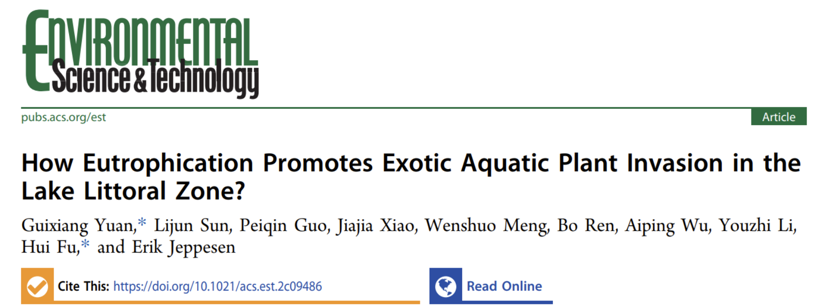 近日,球盟会袁桂香教授和符辉教授团队在学术期刊Environmental Science & Technology上发表了题为“How Eutrophication Promotes Exotic Aquatic Plant Invasion in the Lake Littoral Zone?”的研究论文。