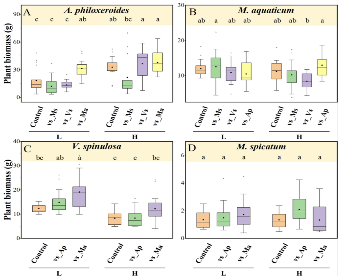 Figure 1. Plant biomass (mean ± standard error, n = 10−18) of two exotic (A, B) and two native (C, D) species. (H: high nutrient, and L: low nutrient. vs_Ap, vs_Ma, vs_Ms, and vs_Vs represent the focal species co-cultured with A. philoxeroides, M. aquaticum, M. spicatum, and V. spinulosa, respectively. Letters indicate significant differences at P < 0.05.)