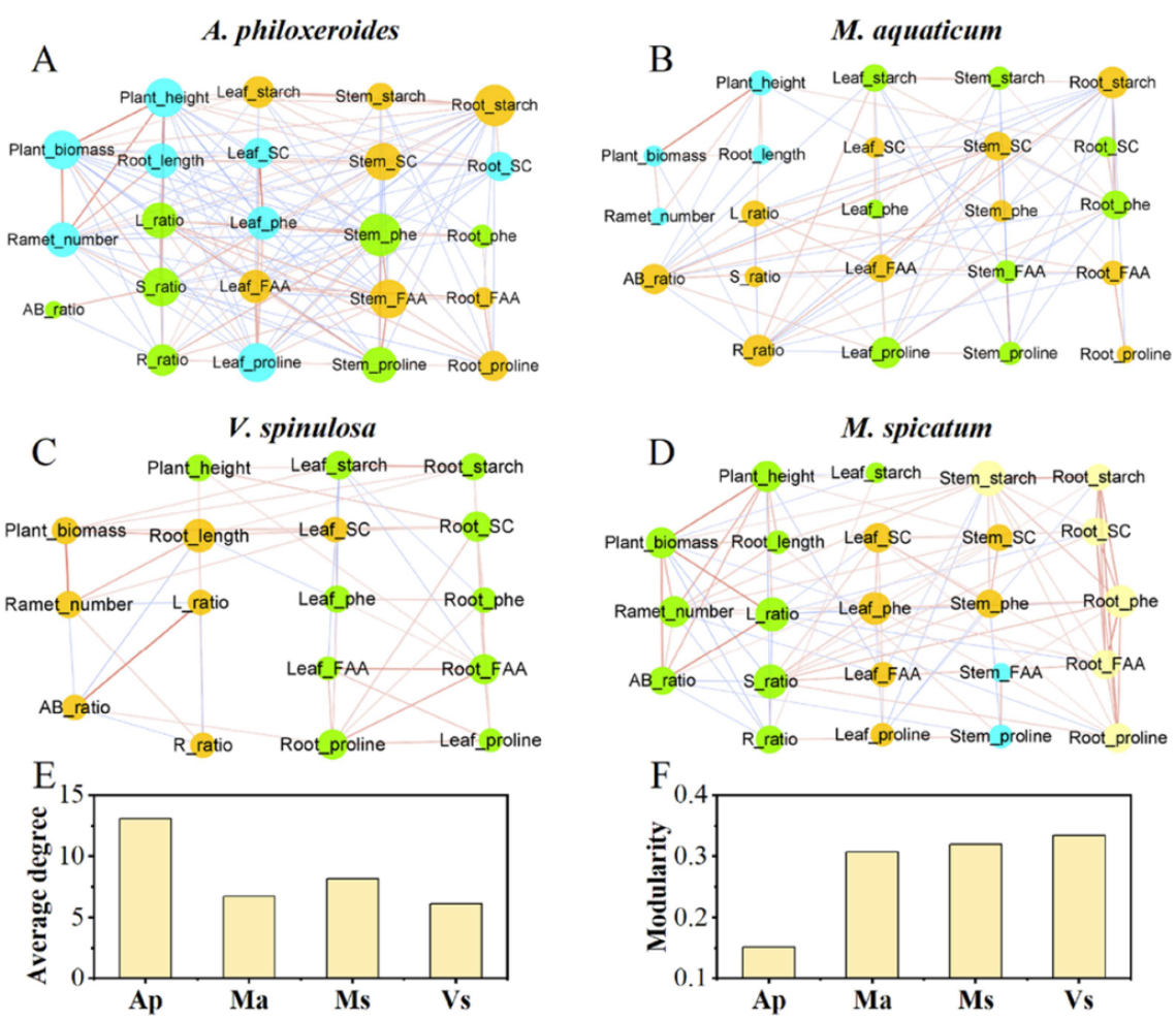 Figure 3. Subplots (A−D) show the network of plant traits for the four species. Similar colored circles in each subplot indicate that the plant traits belong to the same module. The larger the size of the circles, the higher the degree of the plant trait in the network. Red edges indicate positive correlations between the two connected traits and blue edges, negative correlations. The larger the width of the border, the larger the Pearson correlation coefficient for the linked traits. The subplots (E, F) show the network parameters, i.e., average degree and modularity of the four species. Ap: A. philoxeroides; Ma: M. aquaticum; Vs: V. spinulosa; Ms: M. spicatum. SC, FAA, and phe represent soluble carbohydrates, free amino acids, and phenolics, respectively. L, S, and R indicate leaf, stem, and root, respectively. AB_ratio represents above-: below-ground biomass ratio.