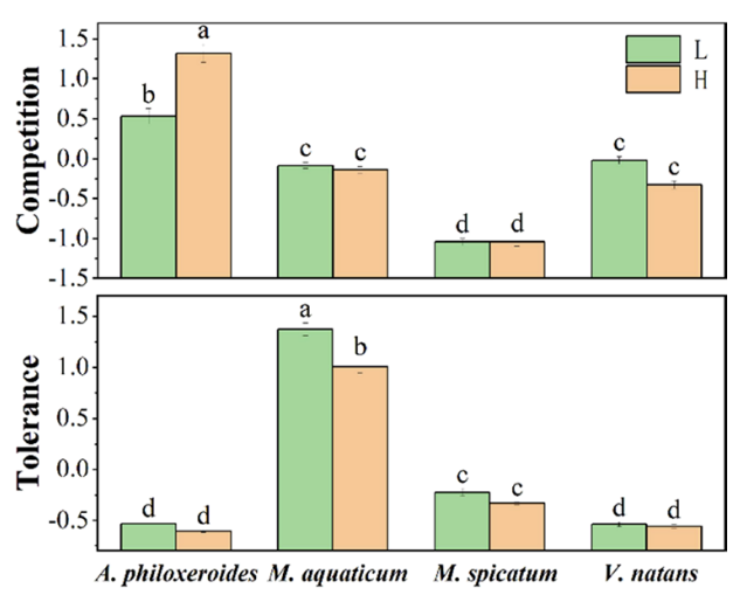 Figure 4. Competition and tolerance of the four species planted at two nutrient levels (H: high nutrient; L: low nutrient). Letters indicate significant differences at P < 0.05.