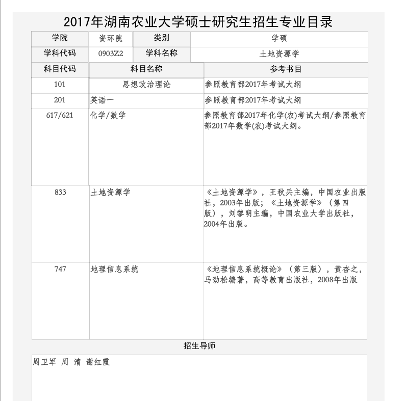土地资源学(硕士)招生专业目录